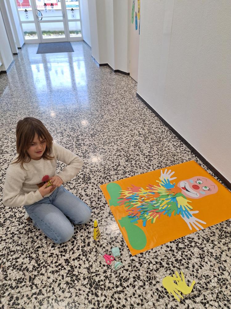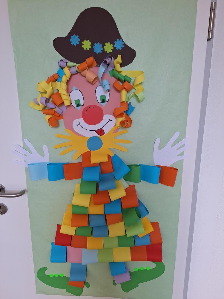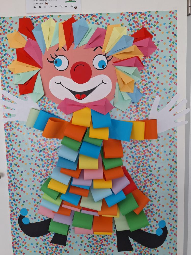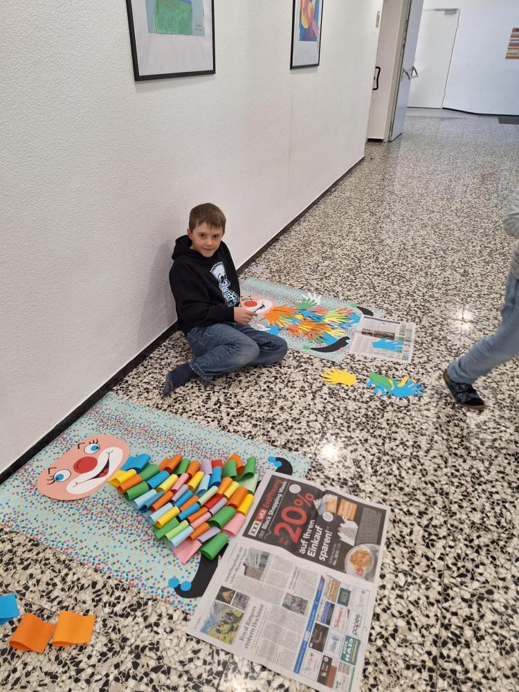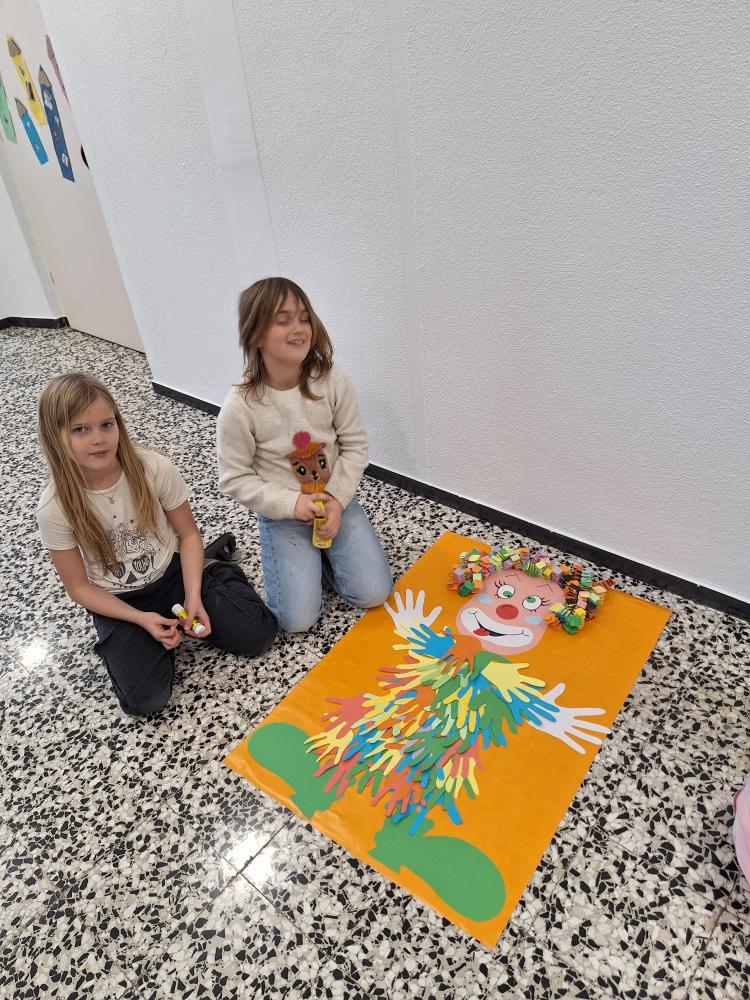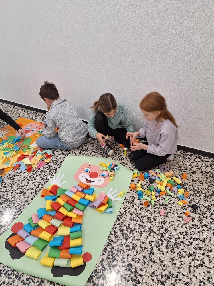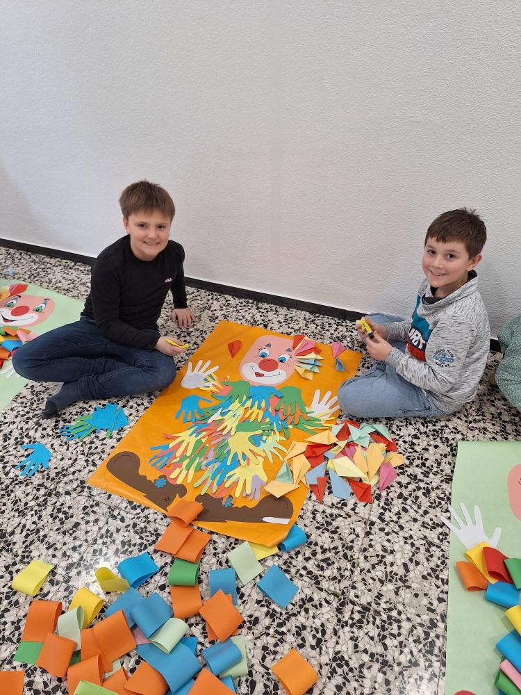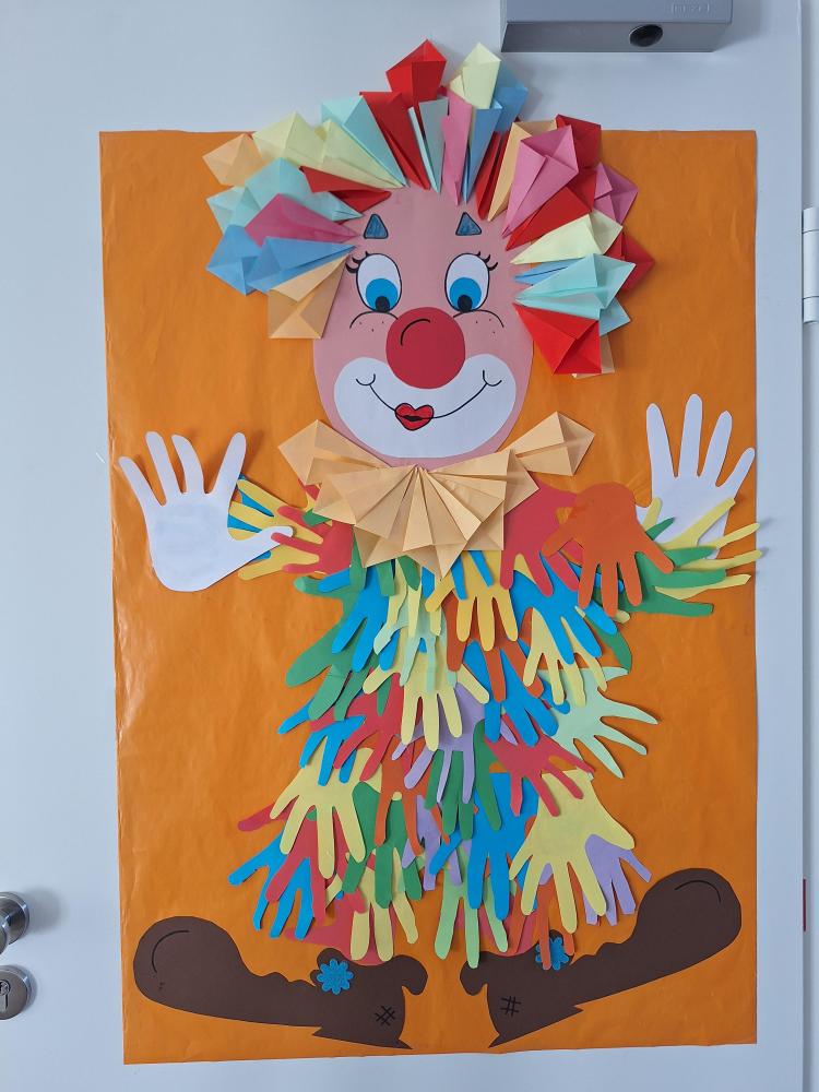 Die großen Kinder aus der dritten Klasse helfen den heurigen Schulanfängern mehrere Clowncollagen zu erstellen. Gemeinsam falten sie Hexentreppen, gestalten Hände und Füße, schneiden verschiedene Teile aus und kleben sie auf. Dabei entstehen sieben lustige große Clowncollagen, die nun das Schulhaus schmücken.