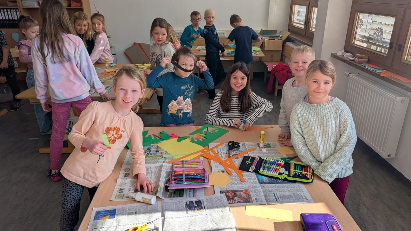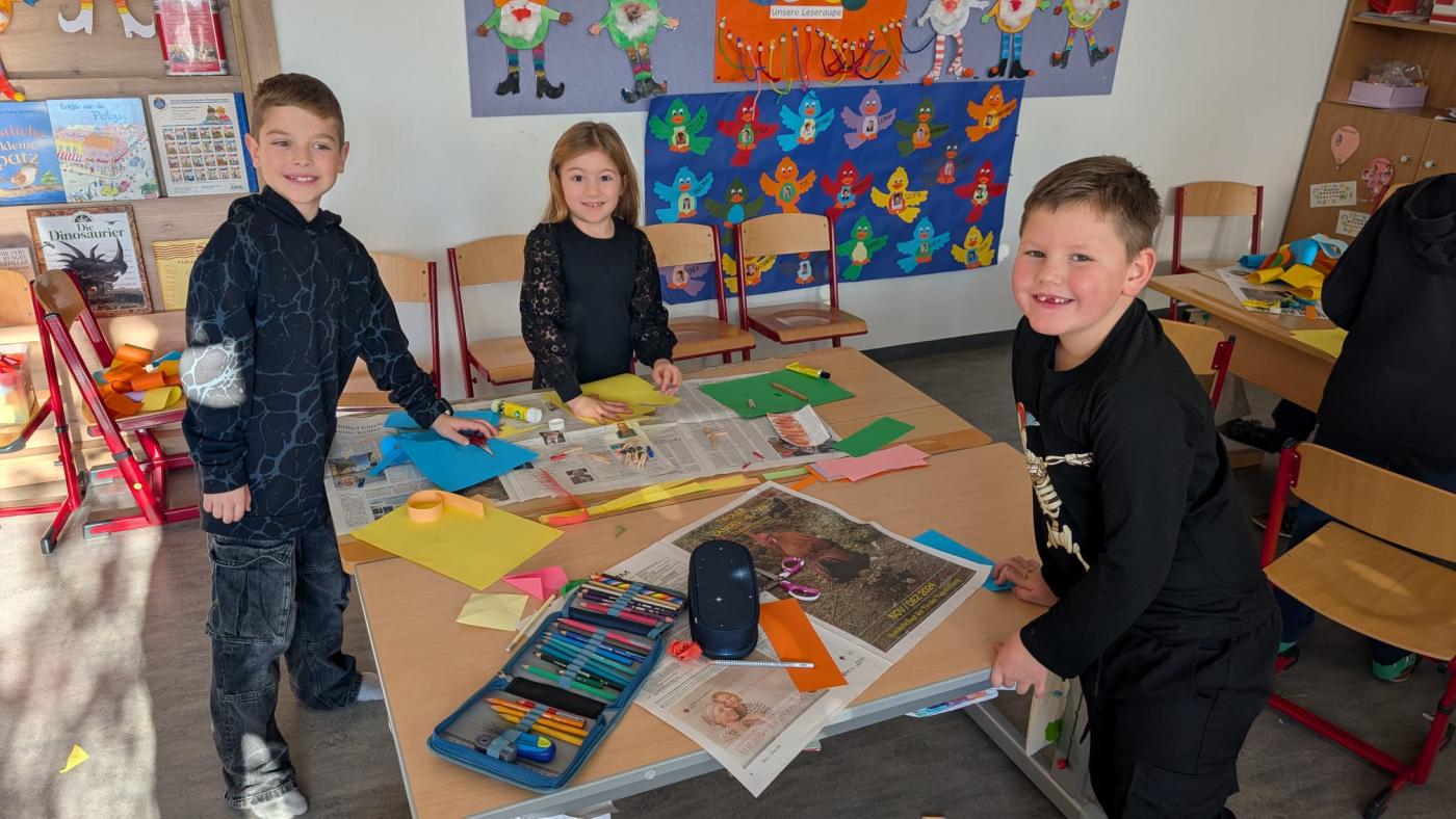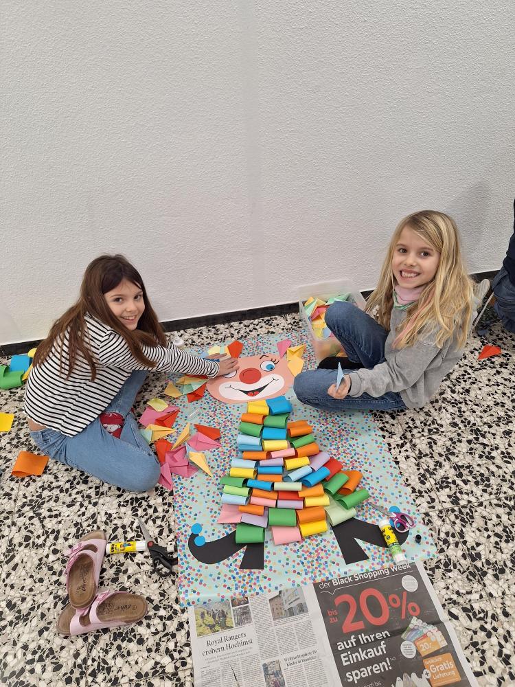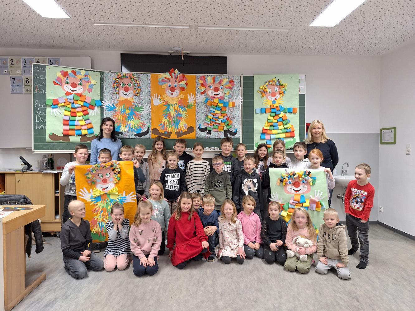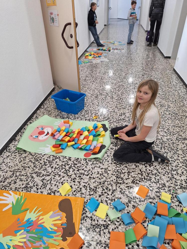 Die großen Kinder aus der dritten Klasse helfen den heurigen Schulanfängern mehrere Clowncollagen zu erstellen. Gemeinsam falten sie Hexentreppen, gestalten Hände und Füße, schneiden verschiedene Teile aus und kleben sie auf. Dabei entstehen sieben lustige große Clowncollagen, die nun das Schulhaus schmücken.