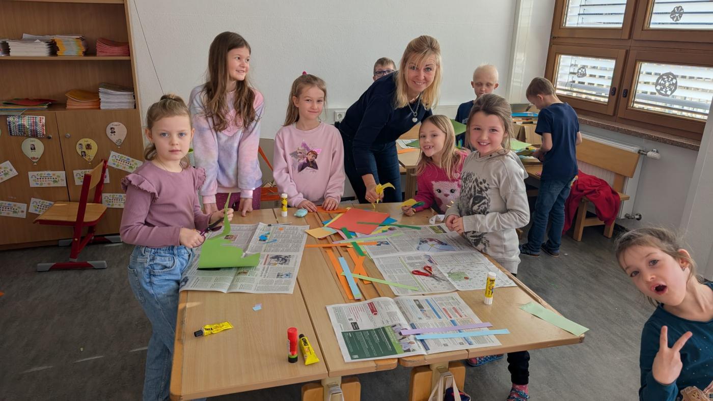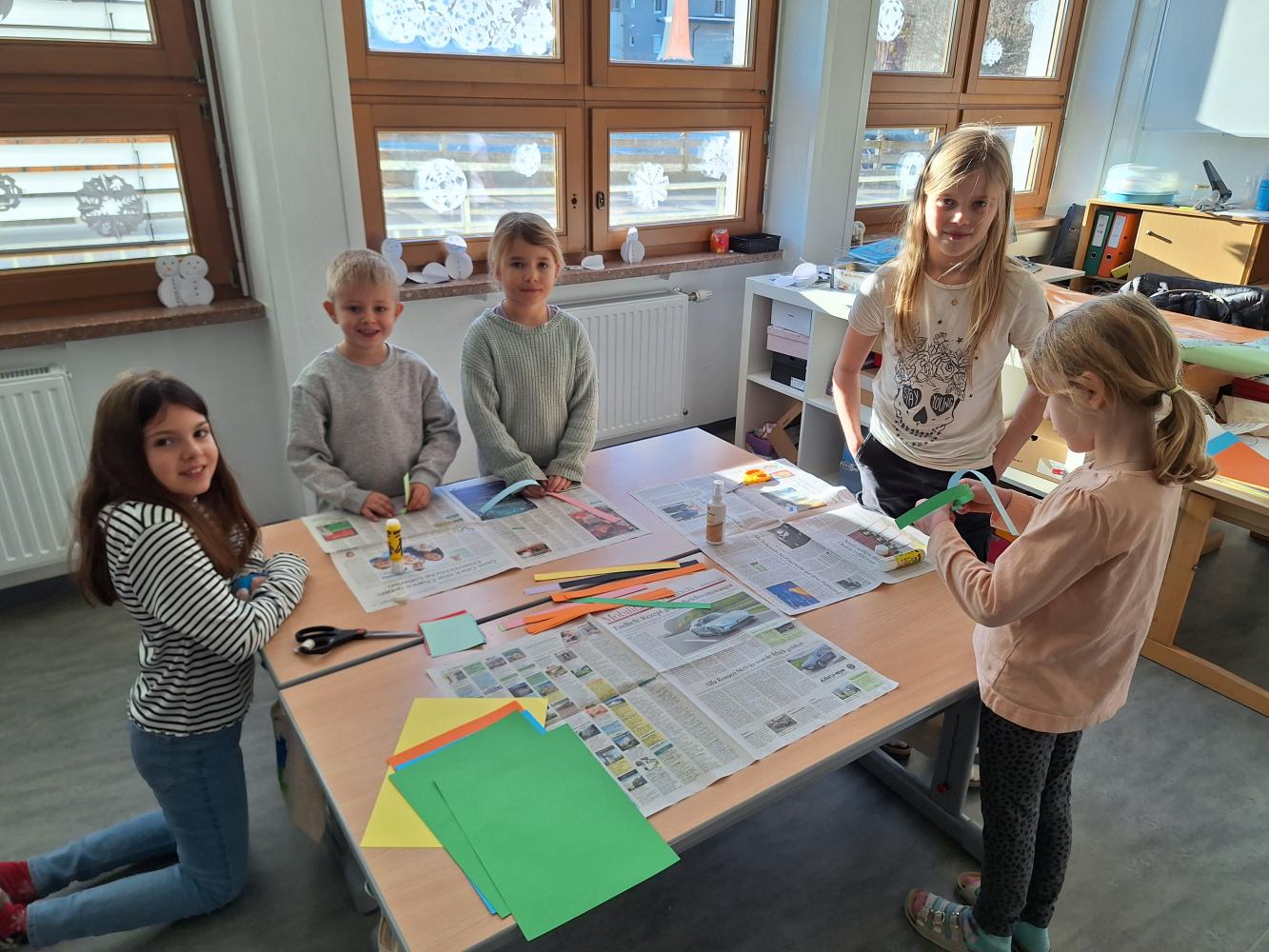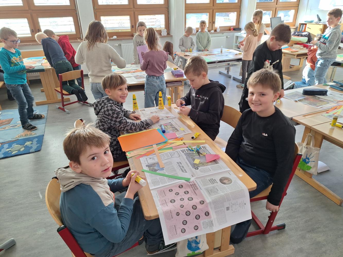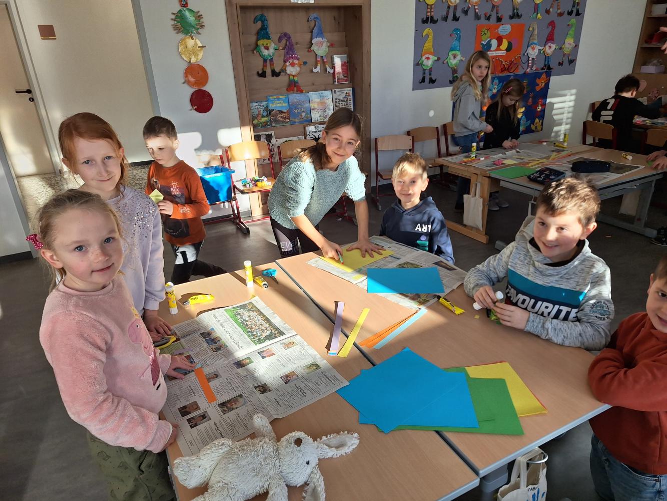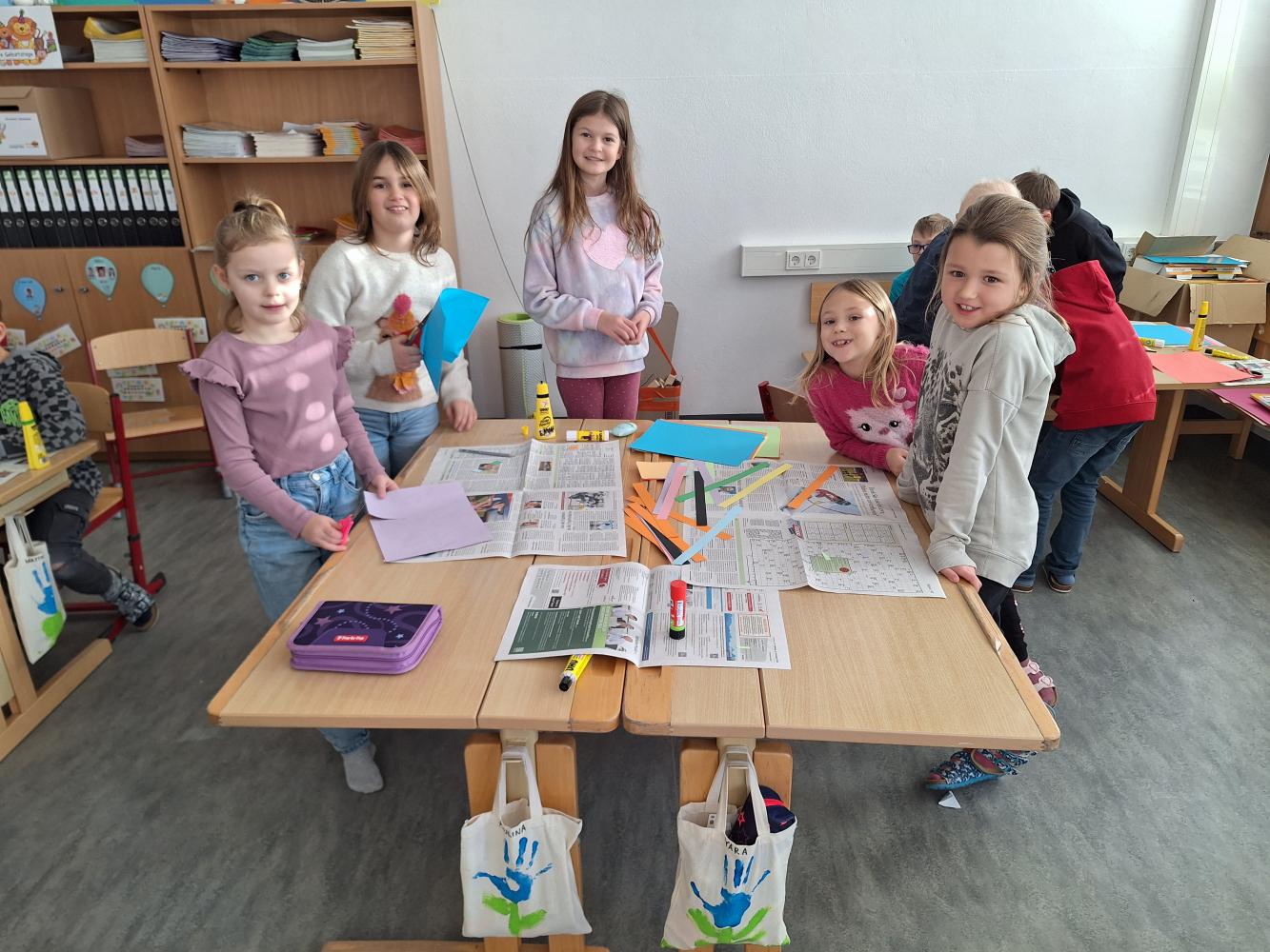 Die großen Kinder aus der dritten Klasse helfen den heurigen Schulanfängern mehrere Clowncollagen zu erstellen. Gemeinsam falten sie Hexentreppen, gestalten Hände und Füße, schneiden verschiedene Teile aus und kleben sie auf. Dabei entstehen sieben lustige große Clowncollagen, die nun das Schulhaus schmücken.